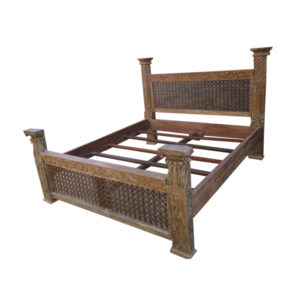 WOODEN OLD ANTIQUE CARVED PILLAR AND PANEL WITH IRON JALI BED (MATTRESS SIZE 180X200)