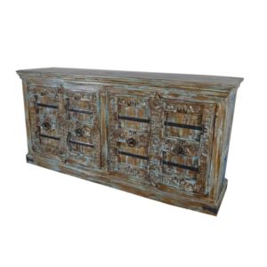 WOODEN 4 DOOR SIDEBOARD SURTI CARVING LIGHT BLUE ANTIQUE FINISHING