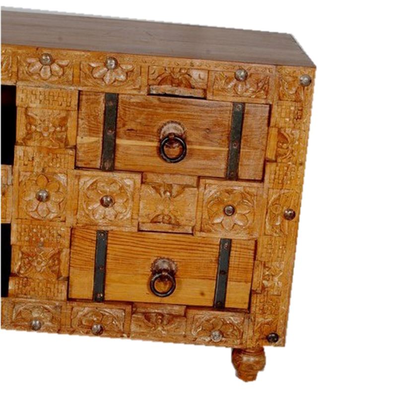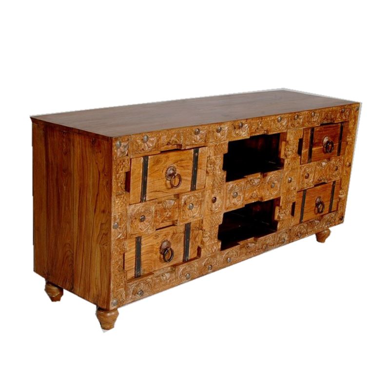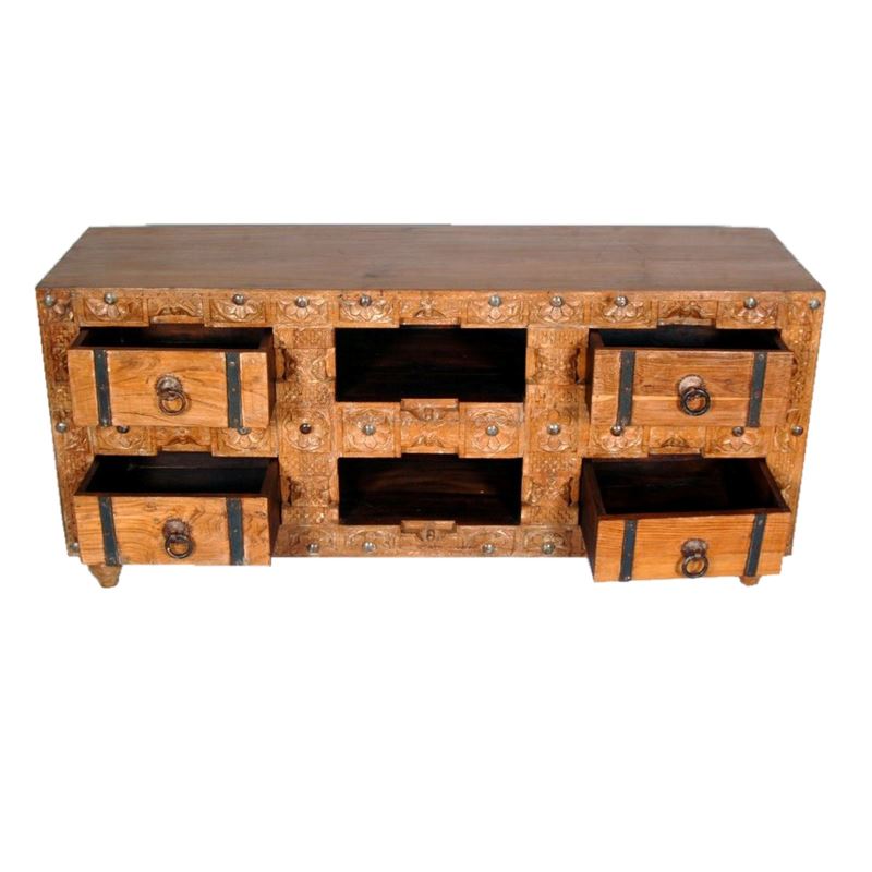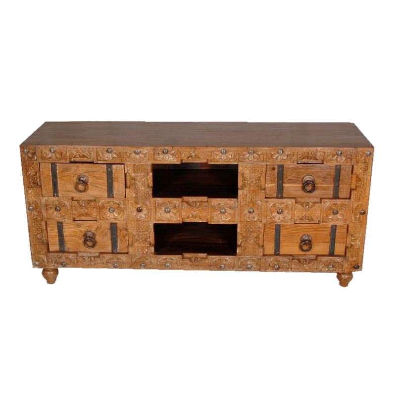 OLD TEAK WOOD 4 DRAWER CARVED MEDIA CONSOLE