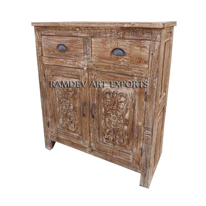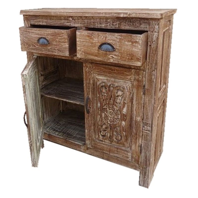 OLD TEAK WOOOD 2 CARVED DOOR 2 DRAWER CABINET