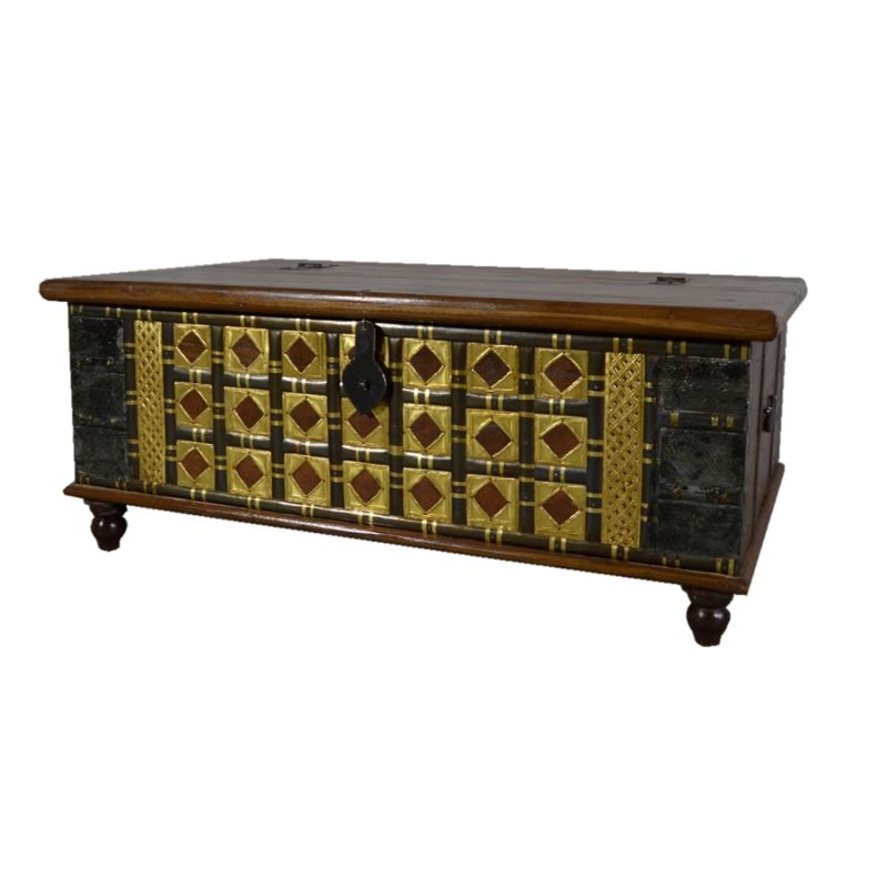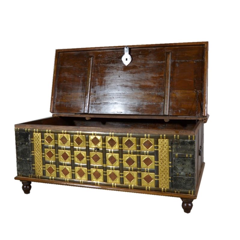 TEAK WOOD BOX WITH BRASS IRON MURALS