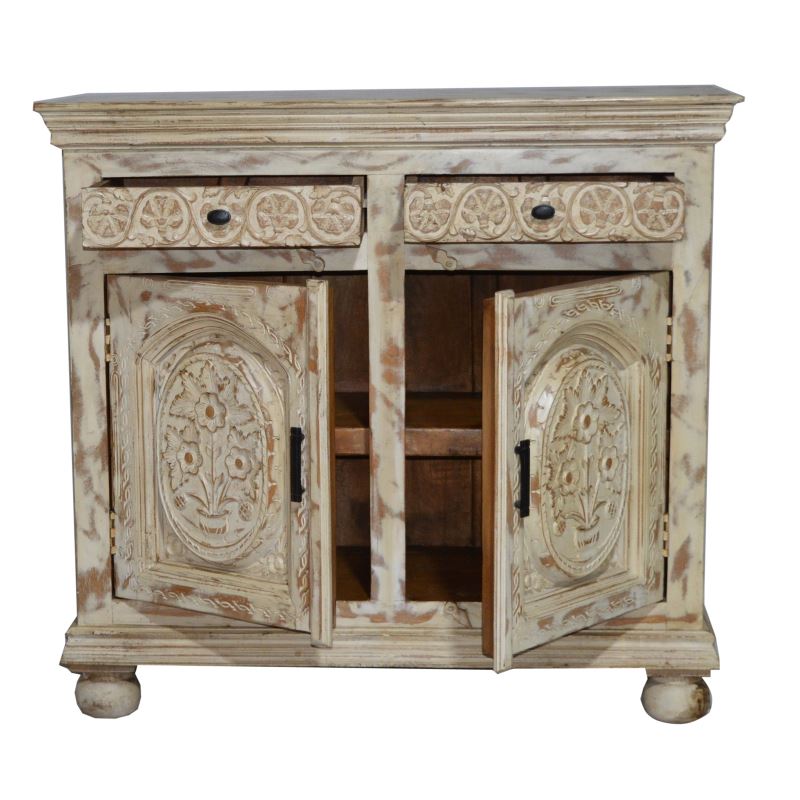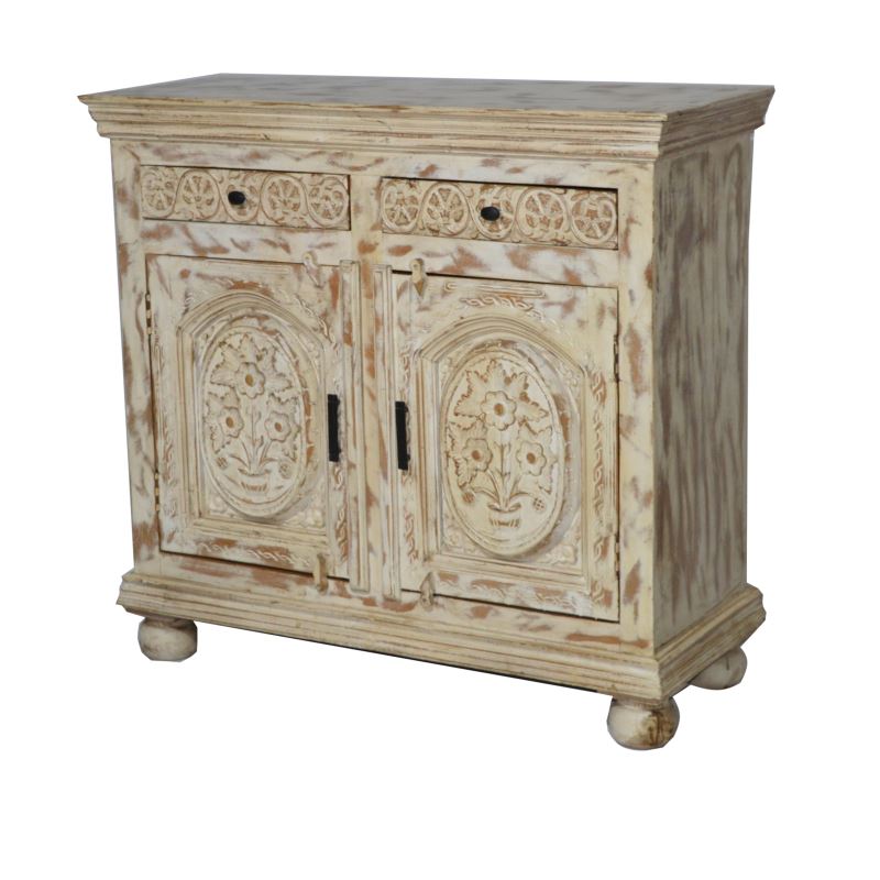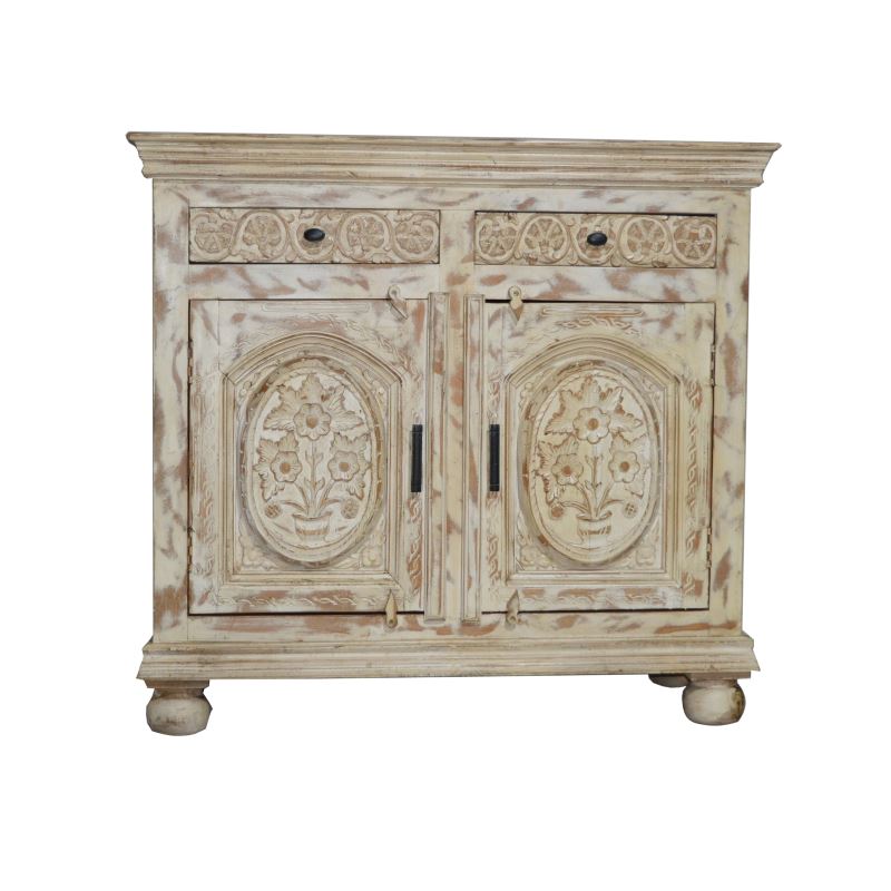 WOODEN 2 DOOR 2 DRAWER CARVED CABINET WHITE COLOUR