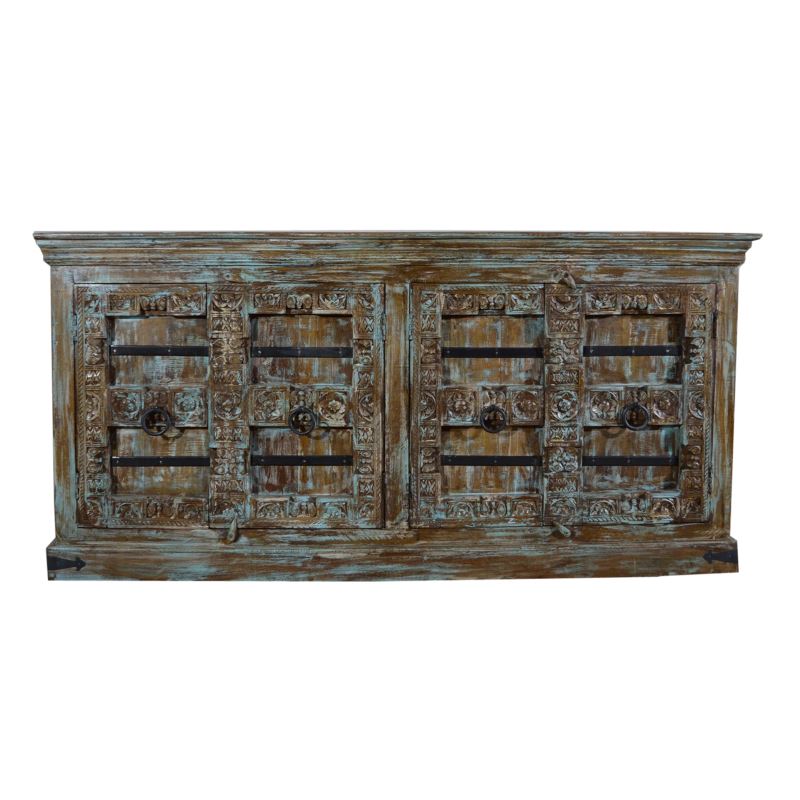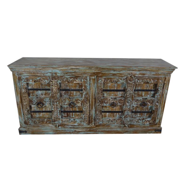 WOODEN 4 DOOR SIDEBOARD SURTI CARVING LIGHT BLUE ANTIQUE FINISHING