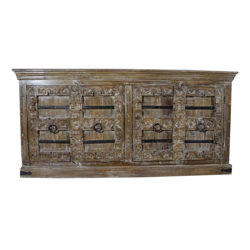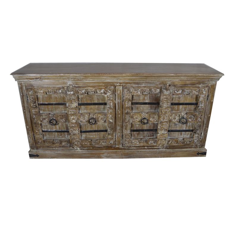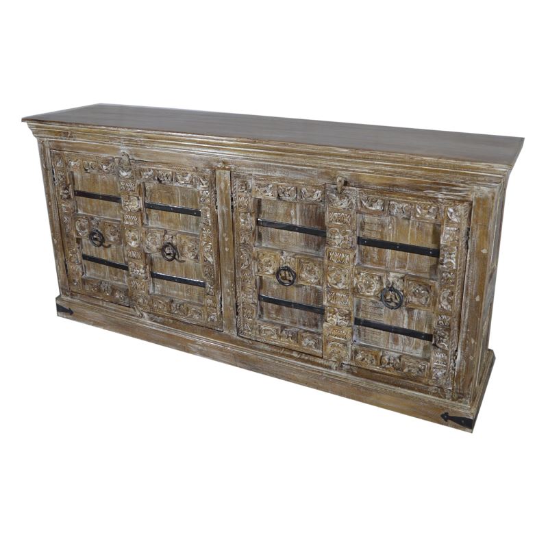 WOODEN 4 DOOR SIDEBOARD SURTI CARVING WHITEWASH FINISHING